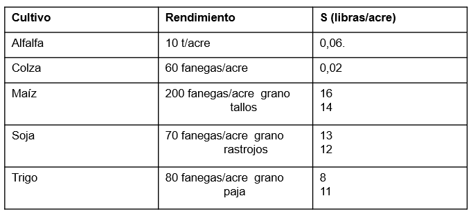 La respuesta al rendimiento de los fertilizantes de azufre varía mucho según los cultivos, los tipos de suelo y las regiones geográficas. Por lo tanto, los agricultores deben consultar las recomendaciones de las universidades para obtener la mejor información para su zona y sistema de cultivo específicos. La alfalfa y la colza tienen unas necesidades de azufre relativamente altas (Tabla 3), y es más probable que necesiten un suplemento de azufre, especialmente, cuando se cultivan en suelos arenosos.